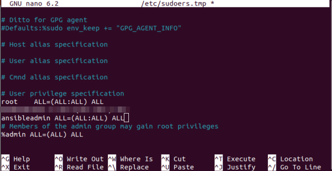 Step3: Add the following line under # User privilege specification: ansibleadmin ALL=(ALL:ALL) ALL