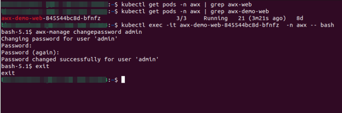 kubectl exec -it <awx-web-podname> -n awx -- bash