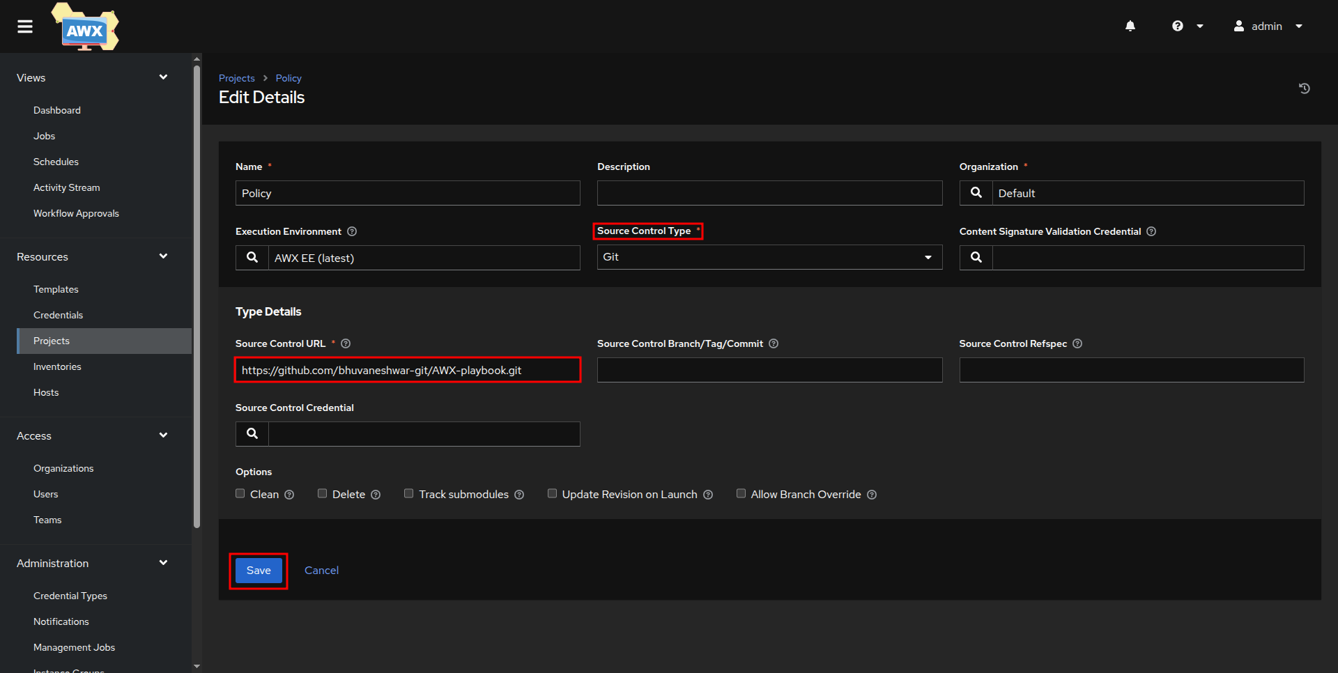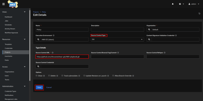 Step 3 : Configure the Git Repository as a Project Source in Ansible Tower