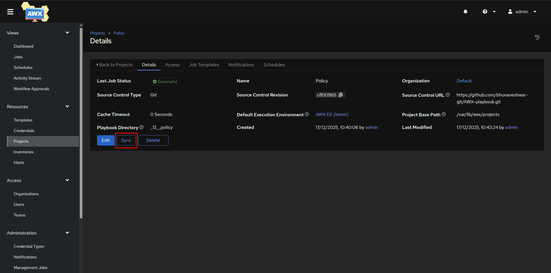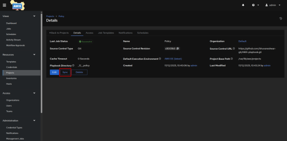 Step4: Synchronize the project in Ansible Tower to fetch the latest playbook version.