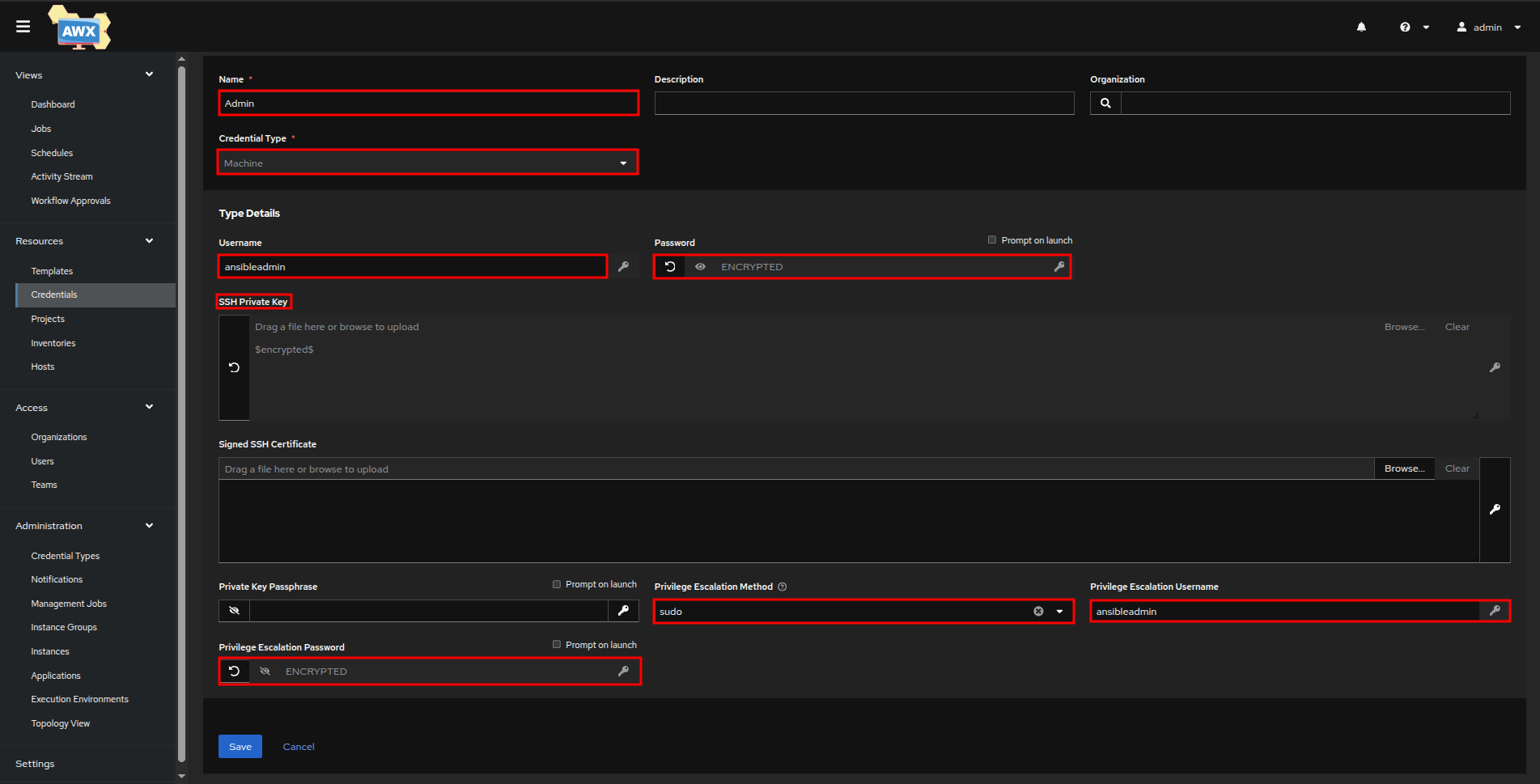 Step3: Configure access credentials to allow Ansible Tower to securely connect to the target systems for automation activities.