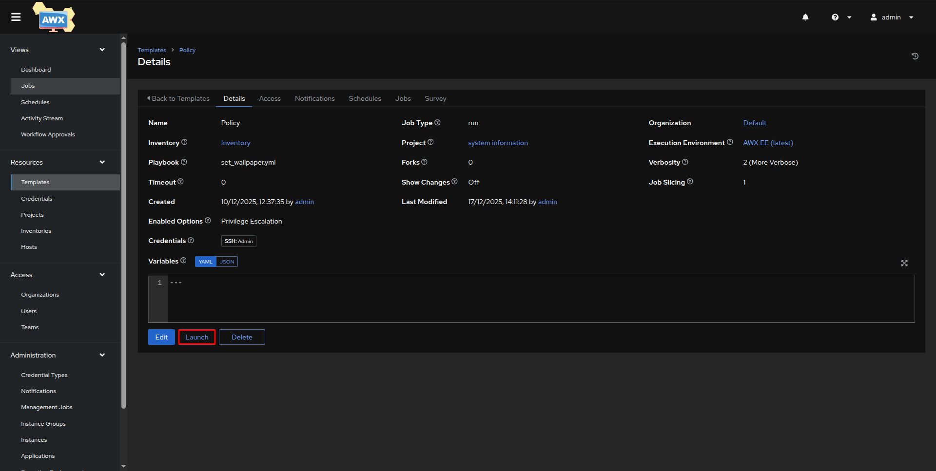 Step4: Create a job template by selecting the inventory (target systems), project (playbook source), wallpaper policy playbook, and the required access credentials.