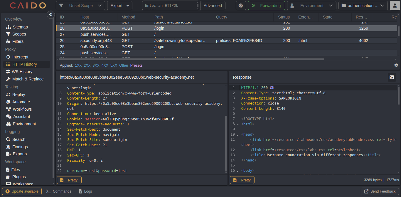 Step 1: Type invalid username and passowrd in login page and inpect using caido