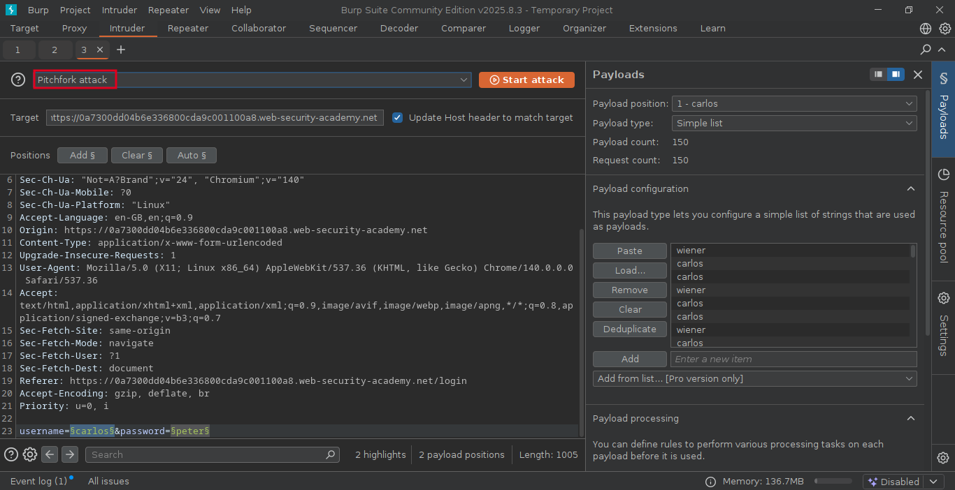 In intruder section, i am selecting pitchfork attack for bruteforcing both username and password