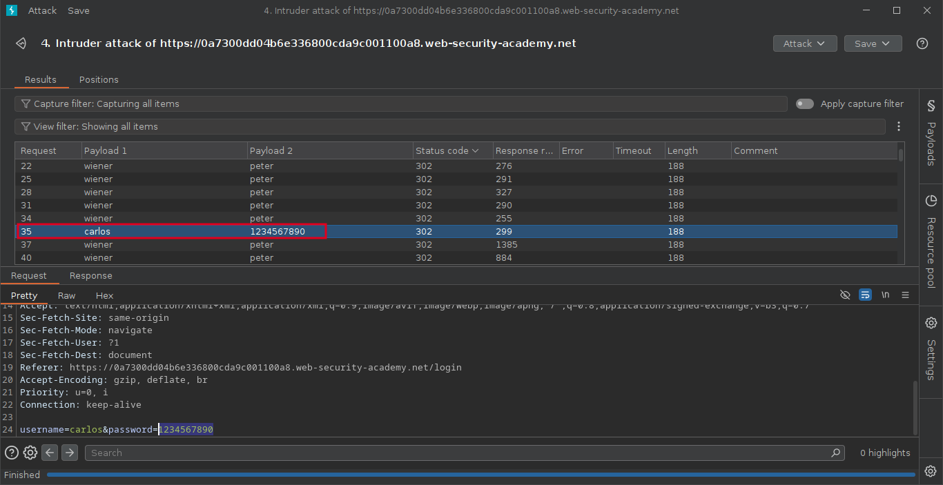 Again i tried using carlos account the server did’t block my ip address so, i concluded that three consecutive wrong credintials given by the user will be temporaily suspend by the server for a minute .